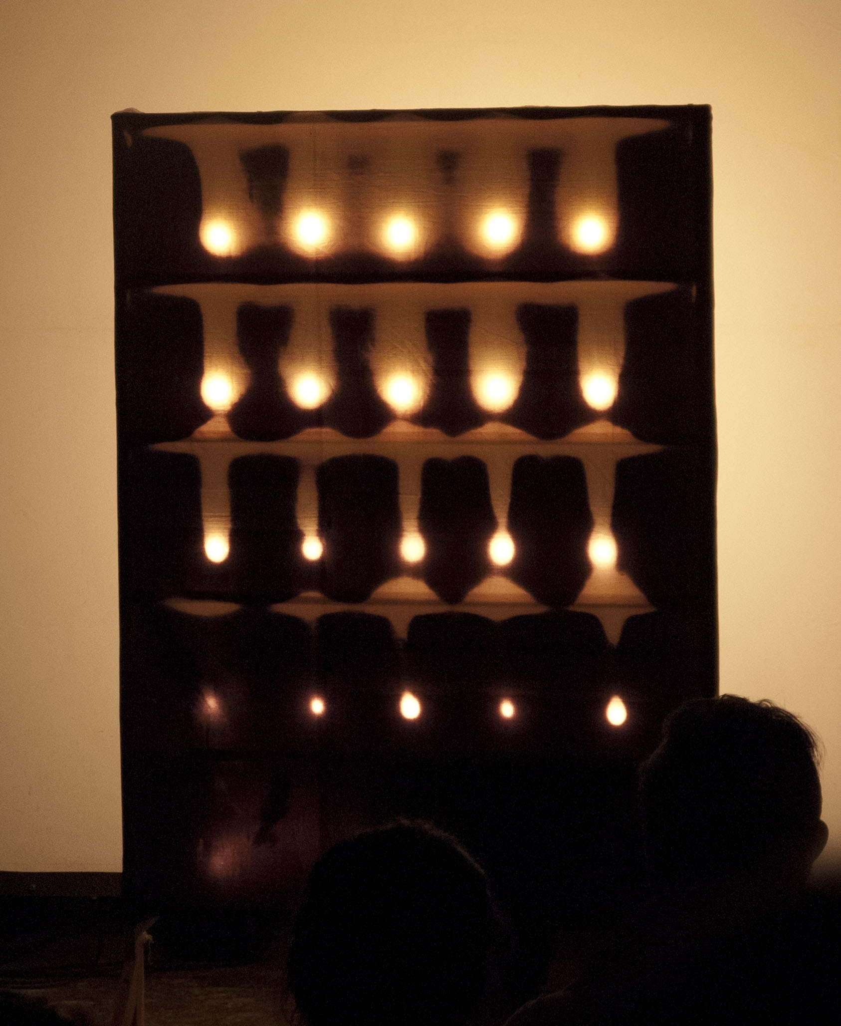 The purest para-cinematic work of the evening was Amy Dickson’s Light Time, in which she creates a time-based event by lighting candles placed in five rows of five behind a dark thermochromic screen. The candles are lit one by one then extinguished. The duration is variable, as are the effects, in which areas of the screen lighten as they are heated by the candles. The flicker of the candle flames is visible as well as the whitened areas, such that different speeds of movement and change are simultaneously visible: the candles flicker at ‘normal speed’, while the heated areas change slowly, taking longer to return to black after the candle has been extinguished than they take to whiten when they are lit. The areas at the top of the screen are larger, presumably because the heat rising from below increases the effect. A third temporal element is Dickson’s performance itself, which is ultimately limited by the time it takes to light and extinguish the candles, but which usually takes longer than this. The complex mix of temporalities recalls some of David Hall’s TV Interruptions (1971), in which time-lapse, real time and static elements are effectively co-present.