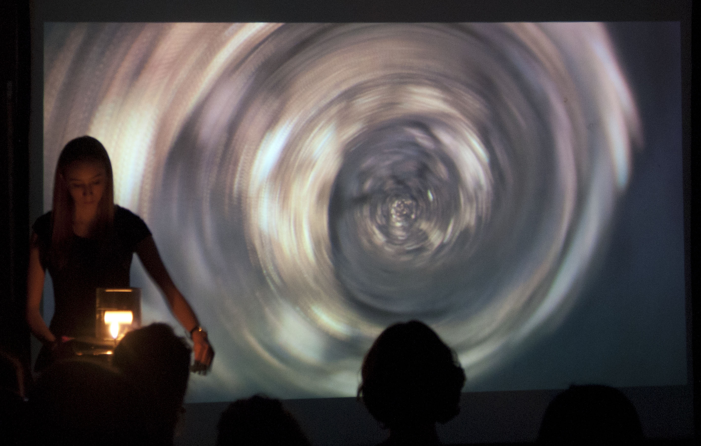 Aura Satz’s film-performance Sound Seam combined extreme close up images of records being cut on a cutting lathe, with a collage of ghostly recorded voices. At the side of the screen Satz manipulated a hand-cranked 78 rpm record player on which was placed a glass box containing a candle. The work wove rotational graphic images with the flickering of real fire and whispered voices to generate a range of ethereal effects.