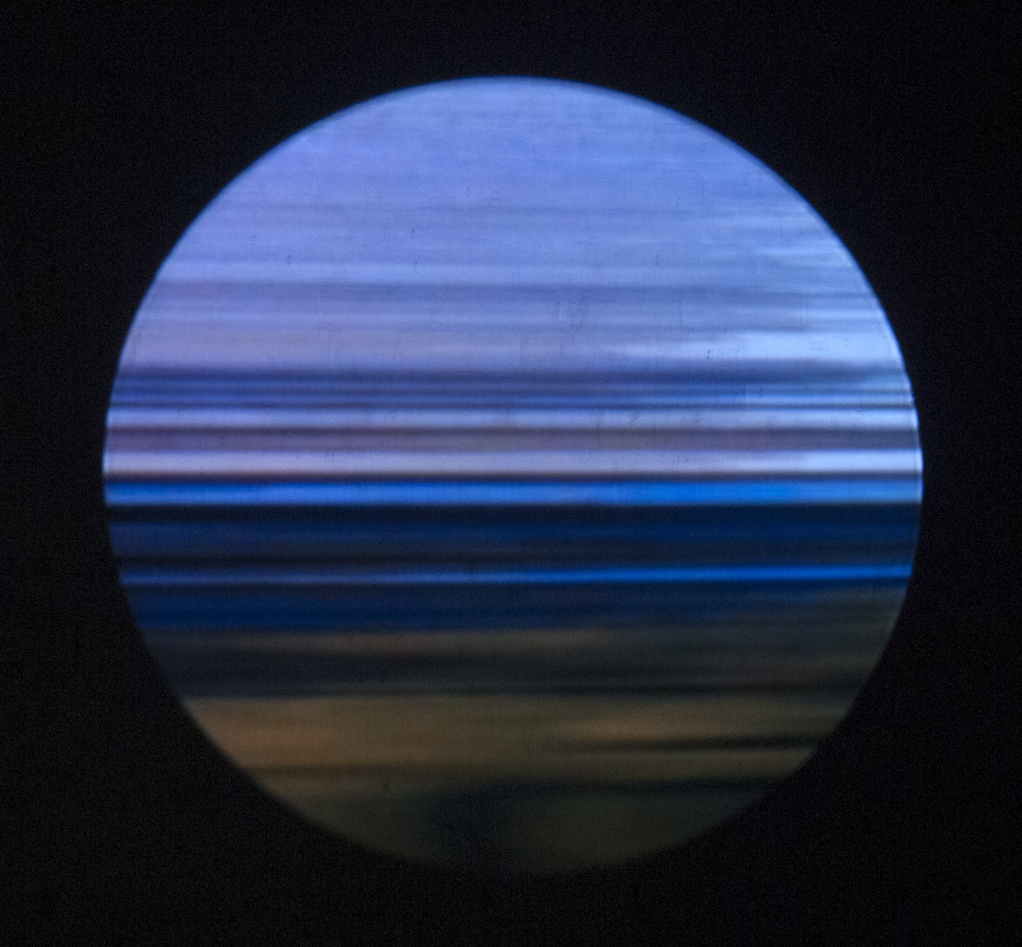 ‘Images of sky and sea on the horizon form linear bands of colour through the spatial and temporal composition of scan lines.The videos are composed of multiple instances of recordings looking out to sea. These have been layered and masked in different configurations with areas one pixel in height, each offset by varying iterations of 1/25th of a second from the next. These layers are duplicated, inversed and reversed for a looping projection such that the images develop through one another like a palindrome, with the textures a series of colour fields; a semblance of nature out of the contradictions and compressions of the video-graphic image structure’ (Polmeer)
