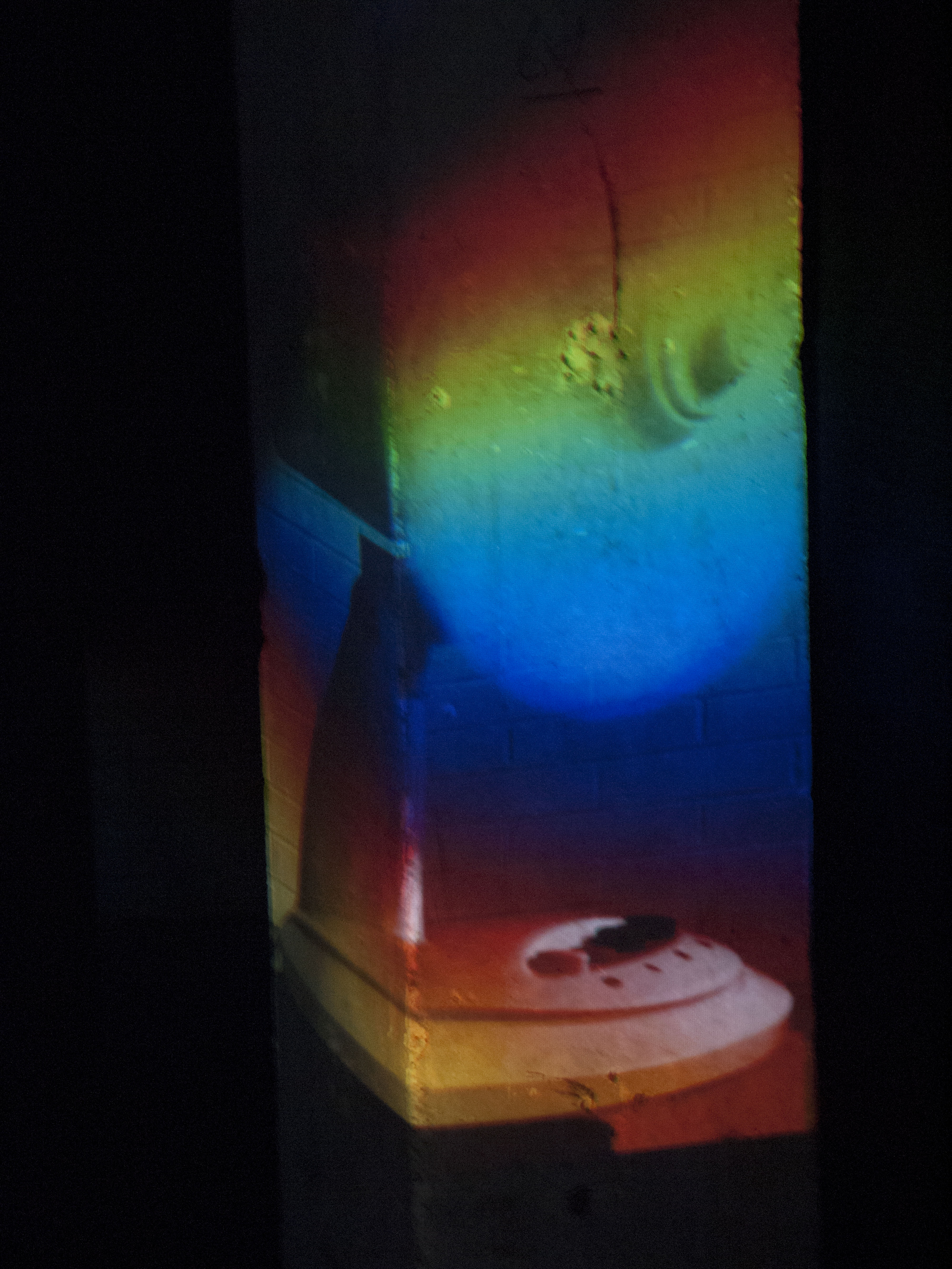 Jamie Jenkinson’s Fan on Fan consists of a projected video image of the rotating blades of a white electric fan, projected through the rotating blades of the same actual fan. The action of the fan blades breaks up the projector’s beam into its constituent colours, which fire in a three-colour cycle at such a speed that we normally perceive them as their composite, ie white light. The fan blade’s moving-image counterpart, the shutter, is an essential component of the technology for shooting and projecting films, which depend on the discontinuous presentation of multiple images to sustain an illusory movement. Here the shutter, the invisible sine qua non of the technology, becomes both subject and structuring device. The fan forms the work’s subject in the image while the actual fan’s presence threatens to destabilize that same image, partly through obscuring its projected counterpart and by breaking the light down into coloured bands. The work is circular (sic), in that an aspect of its own technology becomes its subject matter, which is then recycled via a projection system that disrupts it even as it appears to figure or reveal its functioning. The balance of elements favours the material presence of the video projector and the fan, with the modified image a tentative, albeit necessary presence, whose main function is to refer the viewer back to the precariously sustained conditions of its existence.