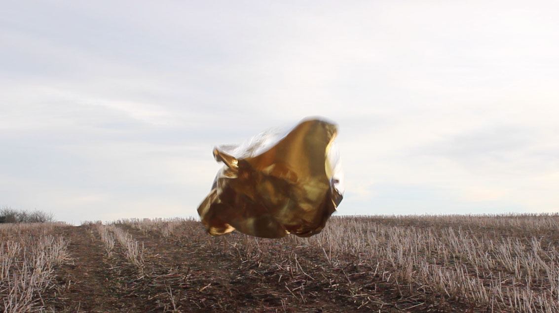 Another seemingly straightforward projection, Sally Troughton’s Set-aside (2013) establishes a simple situation in which the viewer becomes acutely aware of their psychological investment in the image. A gold and silver thermal blanket, attached to two cords held by an out of view operator standing near the camera, dances chaotically in a stubbled winter field. As the wind catches it, it forms ephemeral, billowing shapes, voluminous and bio-morphic, but much of the time it is caught by the stubble and lies inert on the ground. One finds oneself willing it to take flight and hence becomes aware of one’s palpable mental investment, notwithstanding the simplicity of the stimulus, in both the physical and mental sense. The stark contrast between ‘nature’ and the hi-tec fabric gradually breaks down as one realizes that the uniform and precisely aligned stalks of stubble similarly evidence the activities of highly sophisticated technology.