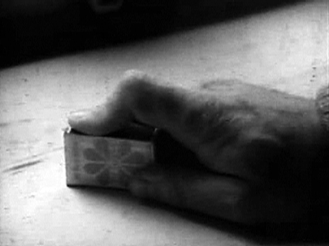 “1. A hand tapping a matchbox on the window-sill with the tap itself coming right in the middle of the take (90 frames).