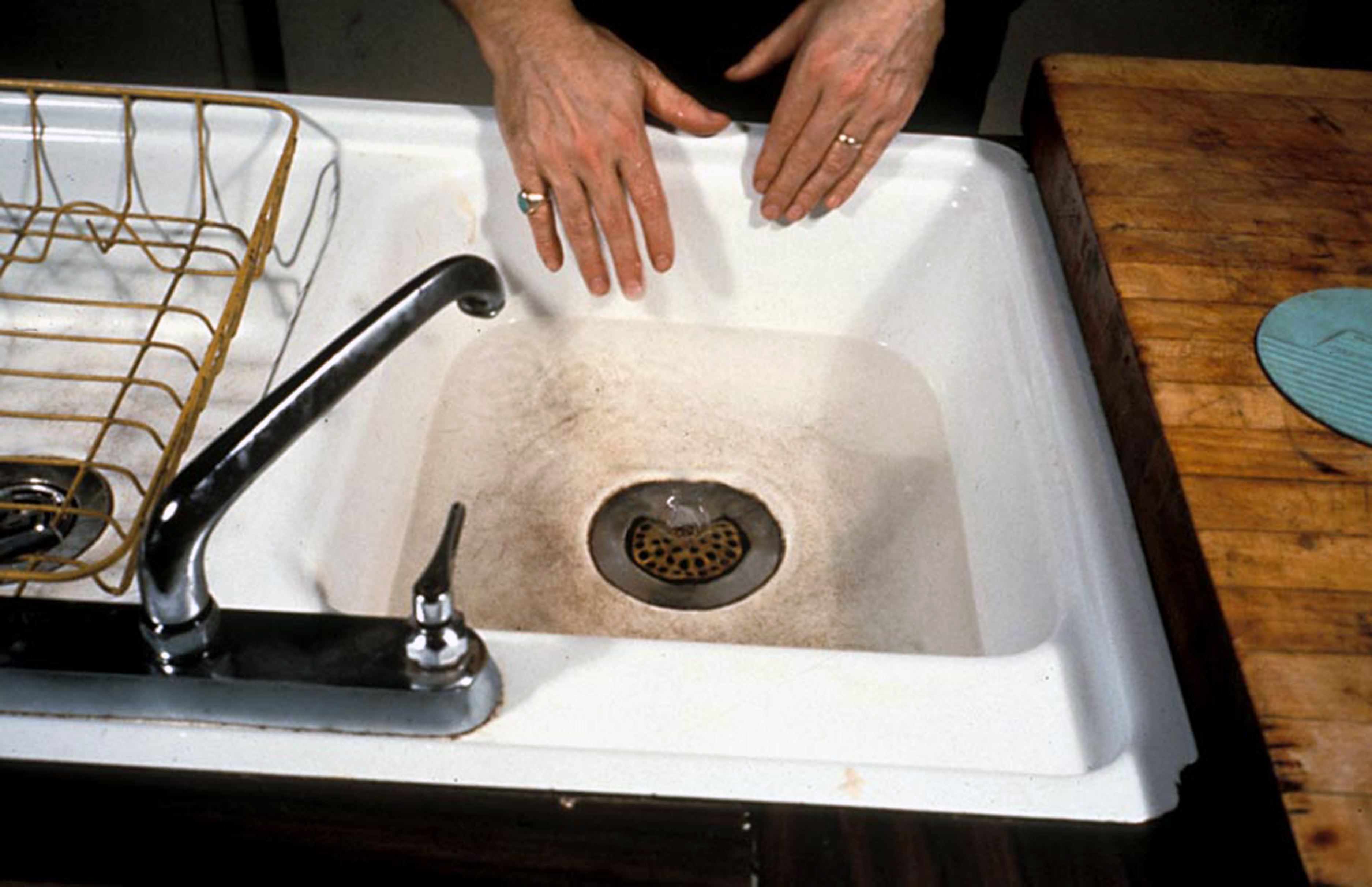 Sound rises from the sink, amplified by its highly resonant volume. Evidently the sink is made from something like fiberglass or thickly coated steel, but not porcelain, and not stainless steel either, which sounds a lot less “dry” than fiberglass. Snow enacts a primitive musical event, using the most natural of beaters –human hands- and a mass-produced, but primitive, resonating body –the sink (5). The latter is rectangular, and its proportions correspond quite closely to the aspect ratio of the film frame: 1: 1.33, corresponding to 3 x 4 in video parlance. Furthermore our angle of view on the sink is similar to Snow’s, so that a kind of symmetrical relationship is established between his extended hands and our directed gaze, which is drawn around the perimeter of the sink by Snow’s hand movements as he drums on its four edges. Curiously, the sink’s design is such that its apparently shorter sides align with the frame’s longer, horizontal ones, and while the sink is symmetrically centred in the frame, the composition as a whole is asymmetrical, with part of the draining board visible to our left and a wooden work surface on the right. The faucet extends into the frame from the bottom left area at a 45° angle, aligning diagonally with, and indicating, a different symmetry, that of the square within the frame’s rectangle (the “1” part of the 1: 1.33 aspect ratio). The sink, which resembles a drum in some important respects, becomes one, in the act of being so used. One could also think of it as a Foley artist’s tool: if one were to put the sound to the image of rain beating on a tar-paper roof, it would be hard to identify its true source.