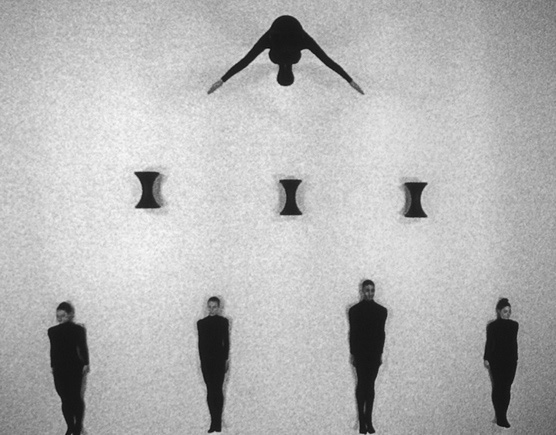 In the second section, Michael Clark’s company perform a dance, shot from high overhead, also in high contrast black and white. The choreographic moves are based on theories of the commodity and are designed to illustrate them. Marx devoted several hundred pages of Capital to analyzing how commodities are formed, how they embody value in the form of materials and labour-time, how, through circulation, they accrue exchange value and how that value can fluctuate according to external forces, so how a short dance sequence can add anything to or elucidate any of this is questionable, especially as the most crucial values in a commodity are invisible, such as monetary values, which are not formal features of the commodity as such. In Man with a Movie Camera, Vertov exposed the invisible labour embodied in a commodity by literally showing workers making things, finished examples of which are then shown being consumed. Campbell’s dance sequence, by contrast, uses ‘formulae’ from Capital to generate a choreographic score, in much the same way that a star map was used to generate the musical score for John Cage’s Atlas Eclipticalis (1961-2), for example, but if one wants really to understand Marx’s theories of the commodity, one is better off reading Capital which is a lucid, if long, read: the dance sequence is about as much use to a student of Marxist theory as Cage’s music would be to the crew of a space ship.