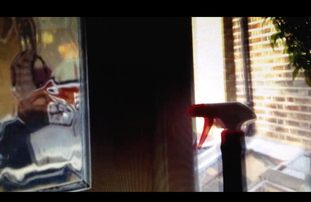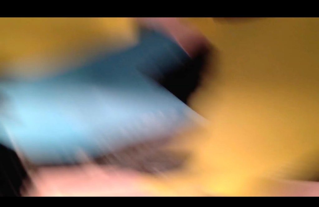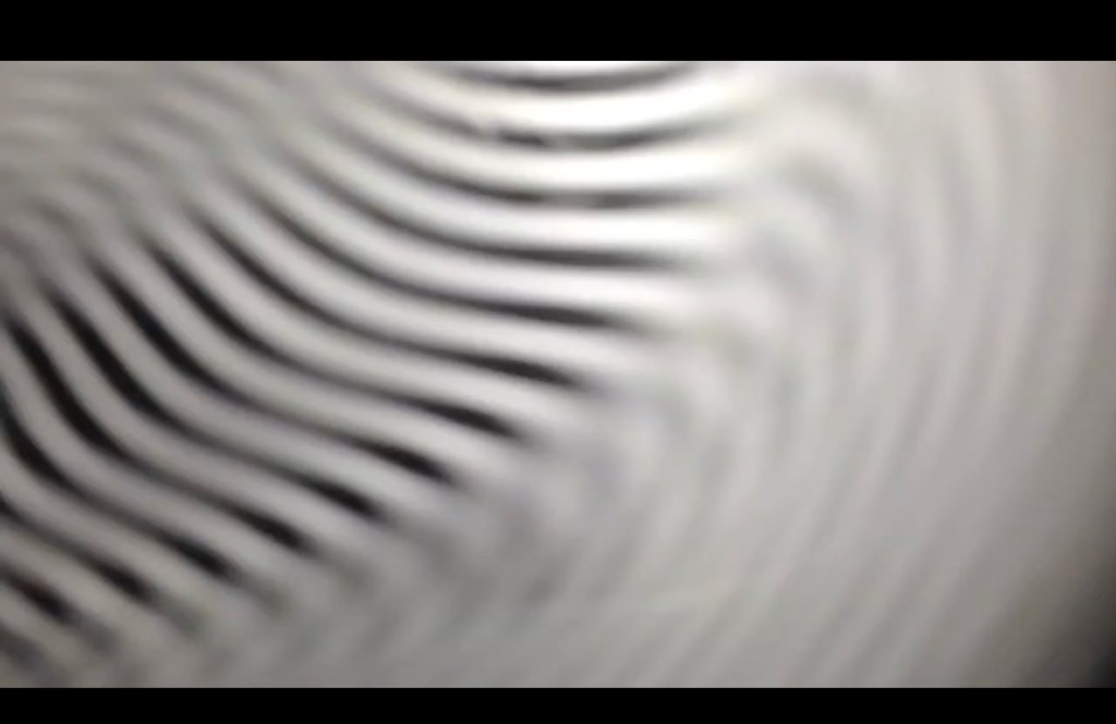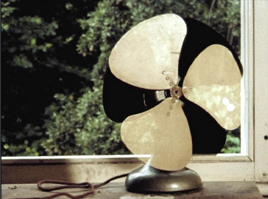 the subject is filmed through a spinning fan, breaking up the image in a manner akin to the way a film camera’s shutter closes between frame movements, so as both to preserve the stability of individual frames and to conceal the movement of the film through the camera.This latter process has historical precedents in John Smith’s 16mm film Blue Bathroom (1978–1979)