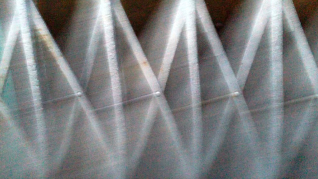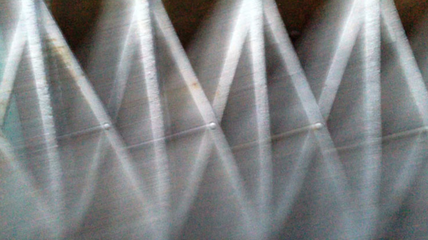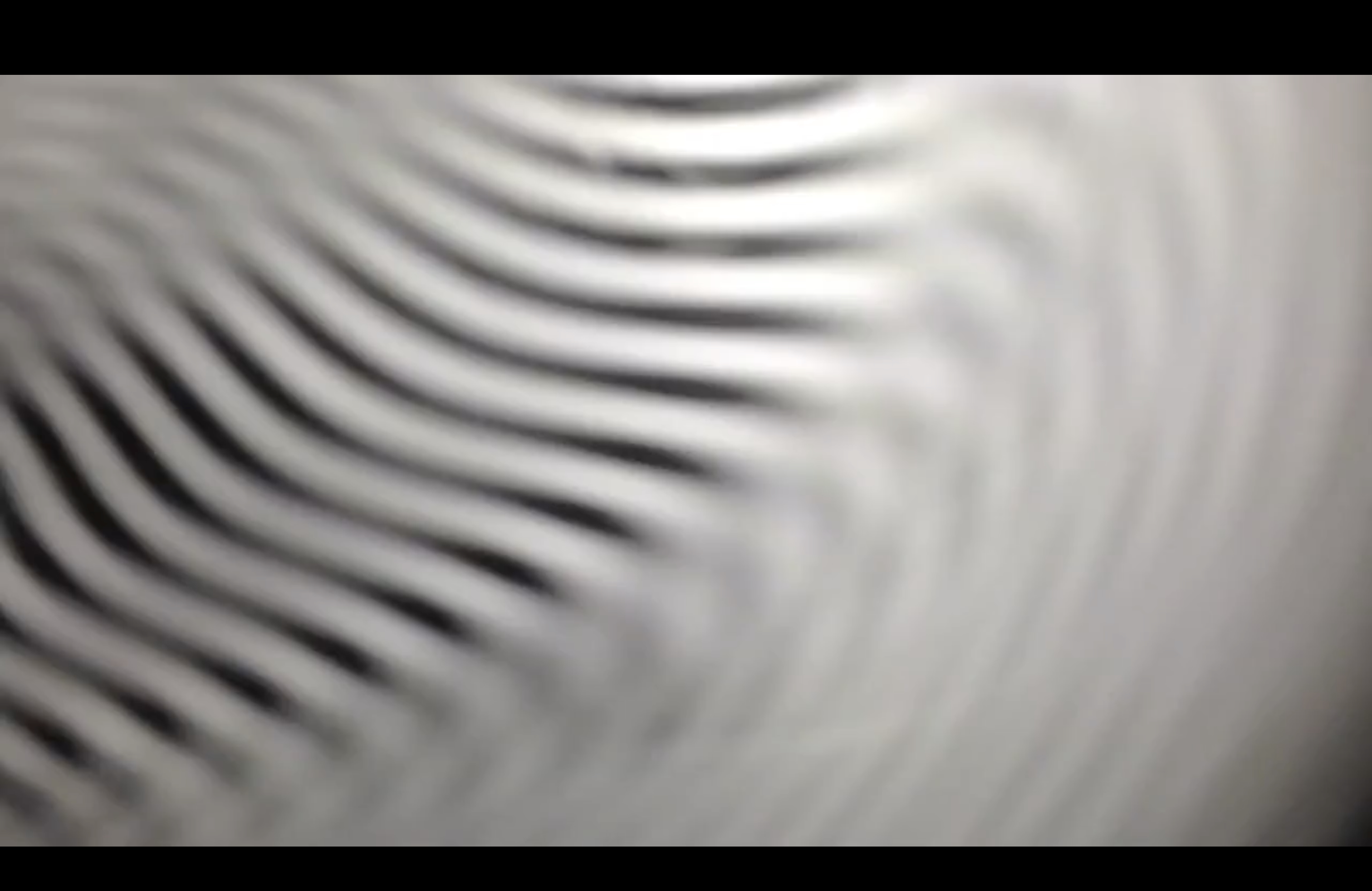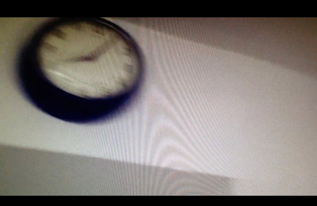 The repetitive pattern and the work’s title again refer to film technologies and processes. The rapid movements of the camera generate distinct virtual lines from rivets in the shutter rods, which connect the rods to form a composite grid from real and apparent/virtual elements within the frame. In a number of other works layering is explicitly structured in, as opposed to being an effect of certain camera procedures. In Two Kitchen Pans (2013) the whole piece is re-filmed off a computer monitor, which imparts a layer of moiré pattern that remains distinct from the footage throughout the piece.