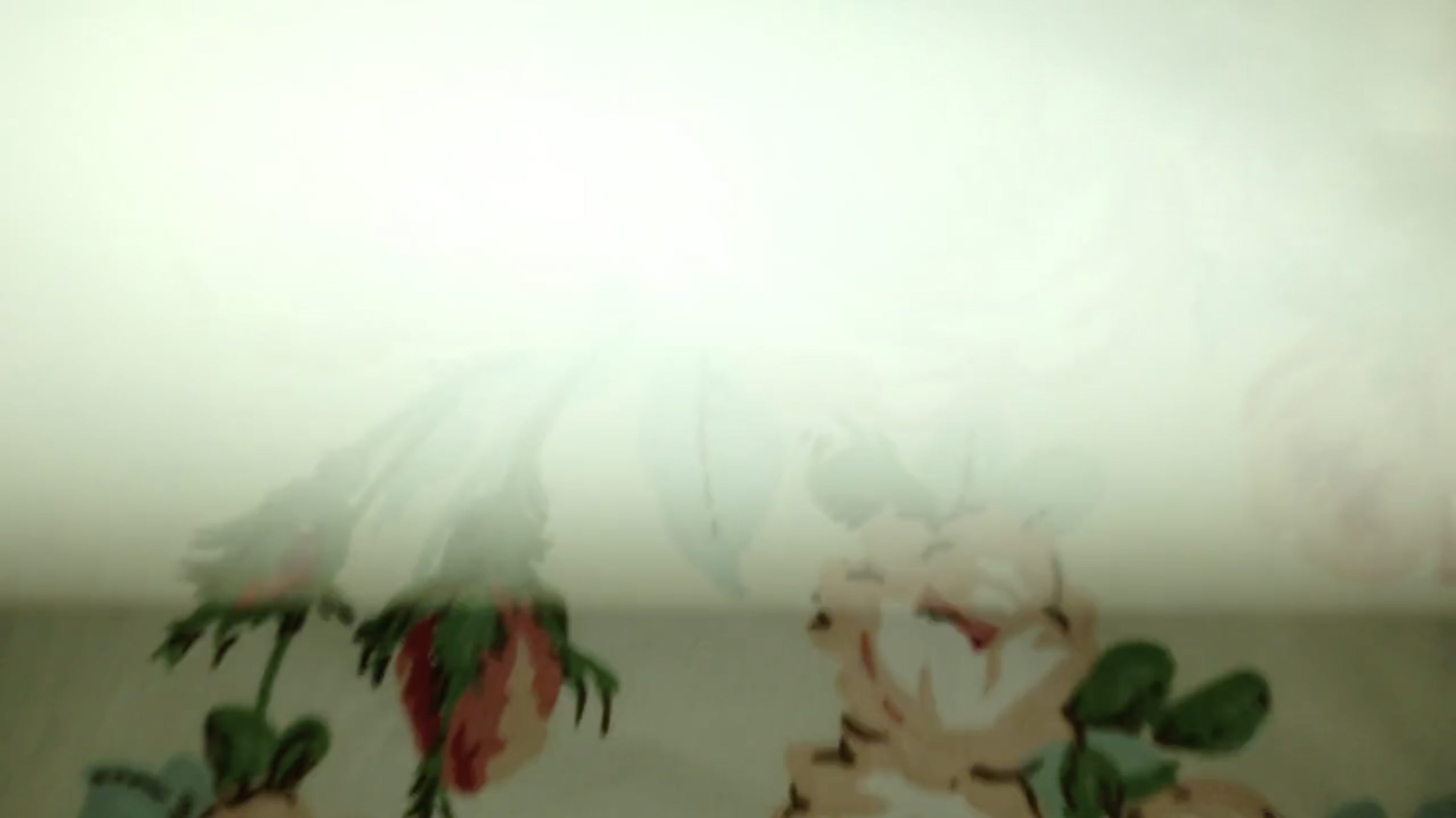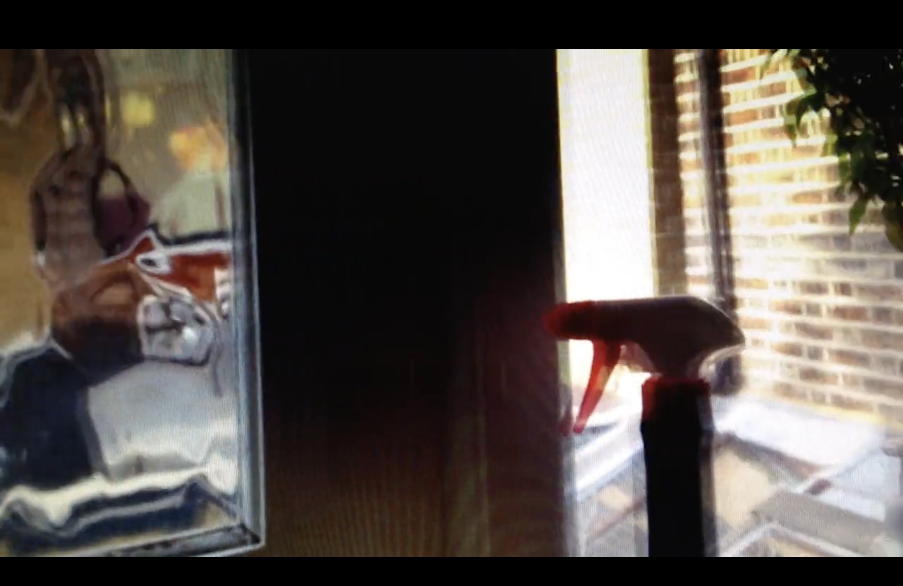 Two continuous camera pans around a room, shot at different times of day, are intercut into short sections so that the flow is interrupted. The scene includes bottles, shelves, potted plants, a clock and a door with patterned glass panels very different to those seen in Obscured Windy Scene. Each segment of pan overlaps with its predecessor, and because of the way they have been made it sometimes seems as if there are three pans not two.