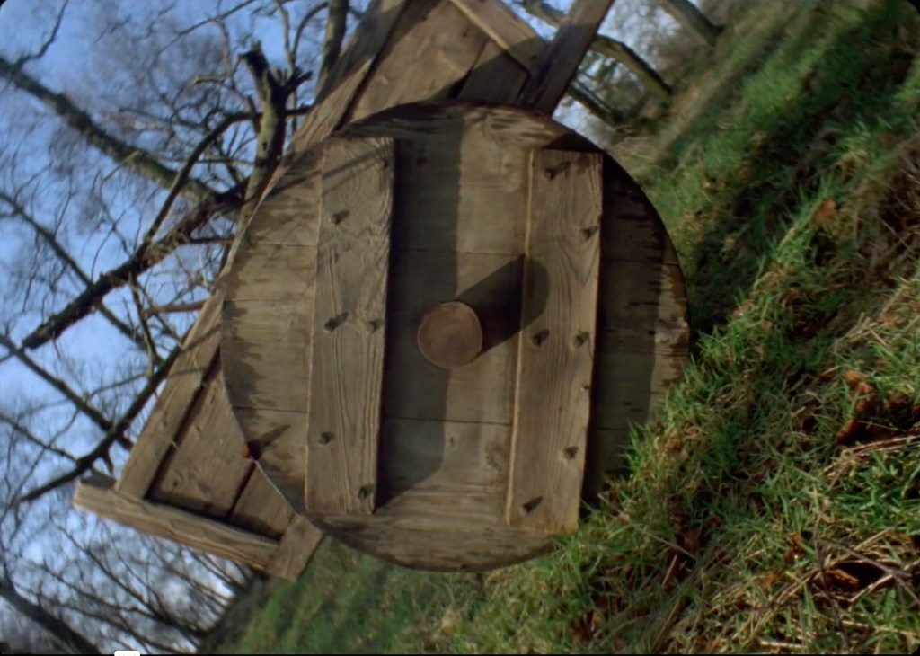 The pie-slice movement is exactly figured in Spiral Staircase. The camera advances up a cast iron spiral staircase, step by step, recursively figuring the manner by which film advances through a camera/projector. The staircase’s structure is given, and is formed from identical units, whereas Jenkinson’s movement up it exhibits small variations from step to step, again in the manner of film frames, which are formed from identical rectangles within which the image typically changes slightly in each one. At a certain point one’s visual sense – one’s ‘seeing as’ – of the image shifts from being that of a point of view shot of a person, to that of a diagonal array sweeping erratically through the frame. (Thereby enacting a perceptual shift that has been most eloquently articulated by Tony Hill4 in his Short Historyof the Wheel (1992) in which, because of the way the camera rotates with its moving subject to hold it static in the frame, it is the ground that rotates about the wheel rather than vice versa)