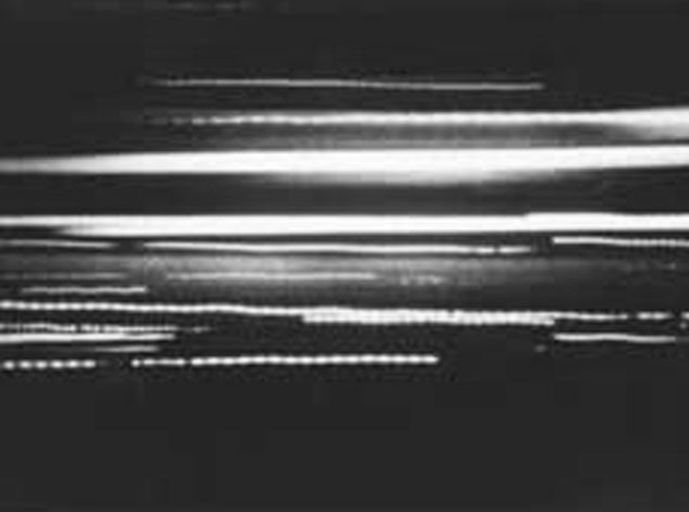 Logically, the areas with the smallest amount of rotation, i.e. those nearest the centre of rotation, and therefore the slowest moving, should appear least blurred, but, surprisingly, this is not the case. Whereas these differentials of movement occur across a single plane, in many of the works the differentials are through or between planes, that is, from front to back, from the camera lens to infinity, in the manner of the parallax commonly seen from a train window, in which distant objects apparently move more slowly than near ones. (The effect is brilliantly explored by Guy Sherwin in his 16mm film Night Train (1979), in which time exposures trace the passage of lights in the landscape across the film frame. Nearer lights draw longer lines, whereas distant ones form shorter dashes and dots. Night Train is a perfect example of a mechanically created photograph: a drawing made by light).