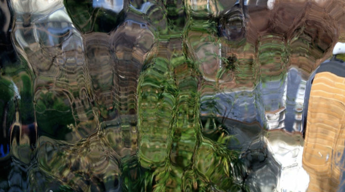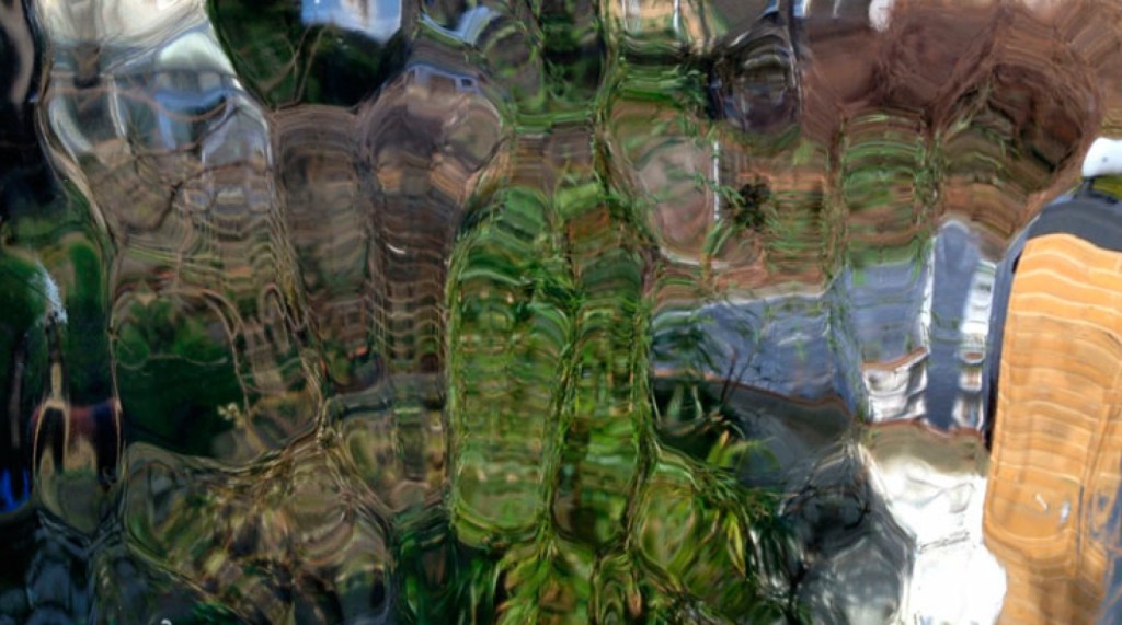 Here the subject, trees blowing in the wind, is filmed through patterned glass. The image is doubly mediated, first by the camera and second by the glass, which functions as a compound lens. Initially we peer through the distorting glass to discern the turbulent foliage blowing in the wind. In a second sense, one that requires the gestalt brought to the first kind of viewing to be overridden, the lozenge shaped areas of glass can be seen as irregular phials containing coloured liquids that move up and down inside them. Each is a video within a video, and once one sees them as such, the image no longer seems distorted, because it has become a self-contained abstract work – it is what it is. Hence ‘distortion’ comes to be seen as such only in the context of a normative concept of representational imagery: it is an instrumentalist, ideological term, not an empirical one.