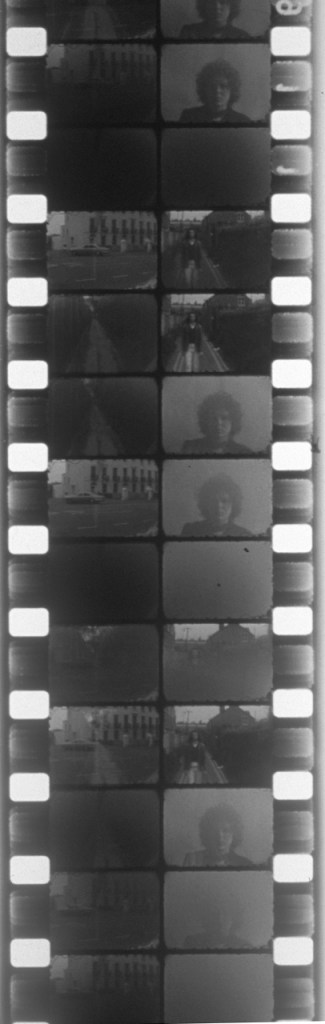 Rhythm 1 permutates four possible camera – subject relationships; still camera and moving subject, vice versa, still camera and still subject, moving camera and moving subject. Each side of the film was exposed twice, using a hand powered propellor in front of the lens to arbitrarily generate three possible combinations of image; no exposure, single or double exposure. The sound track is the noise of the sprocket holes (48 per second @ 24 fps projection speed).